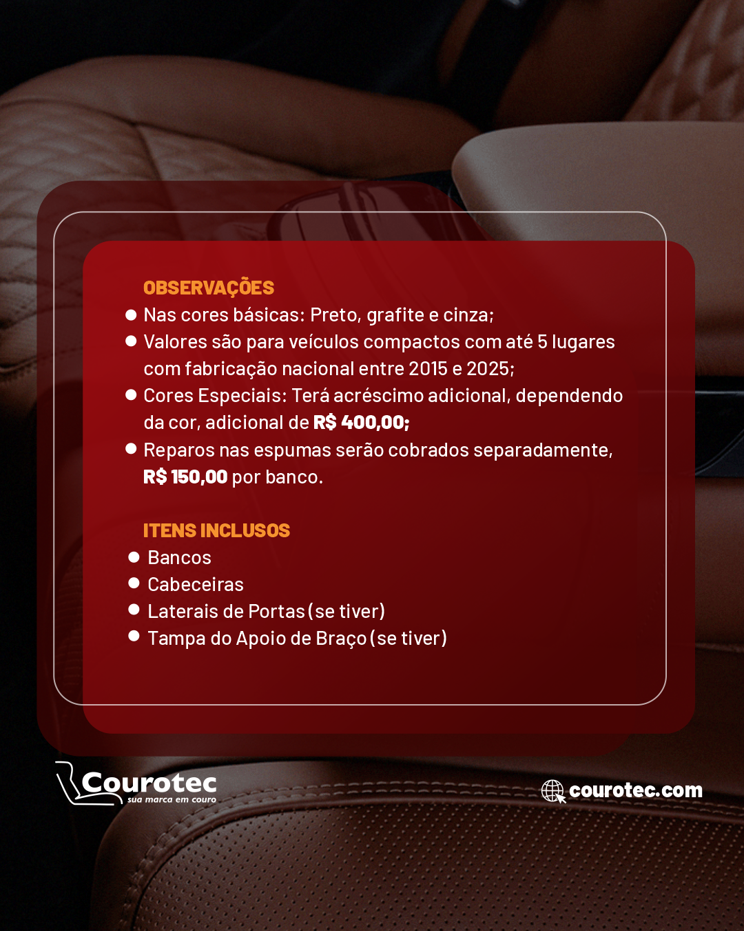 Esta é a combinação perfeita que faz da Courotec Curitiba uma das mais conceituadas empresas de revestimentos em couro do Brasil. O grande cuidado que a Courotec Curitiba aplica durante todo processo de revestimento, que vai desde a desmontagem dos bancos e painéis de portas até a instalação com a costura e os ajustes finais, assegura ao cliente um resultado impecável com garantia permanente da montagem.